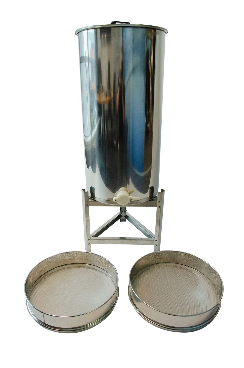 - Stainless steel tank for honey storage with 50kg capacity, with 47mm honey gate, stand and double strainer