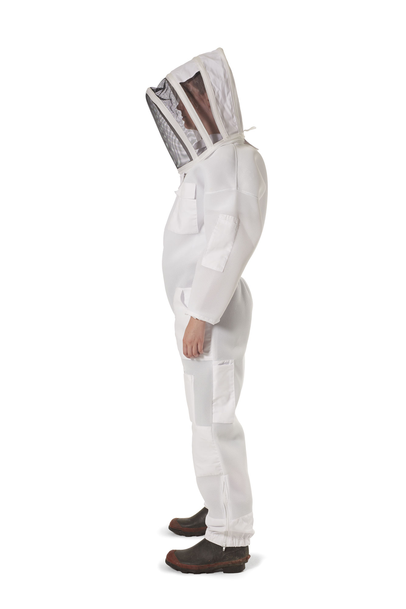 - White vented bee suit with folding hood is new and improved, with thicker material which is still breathable