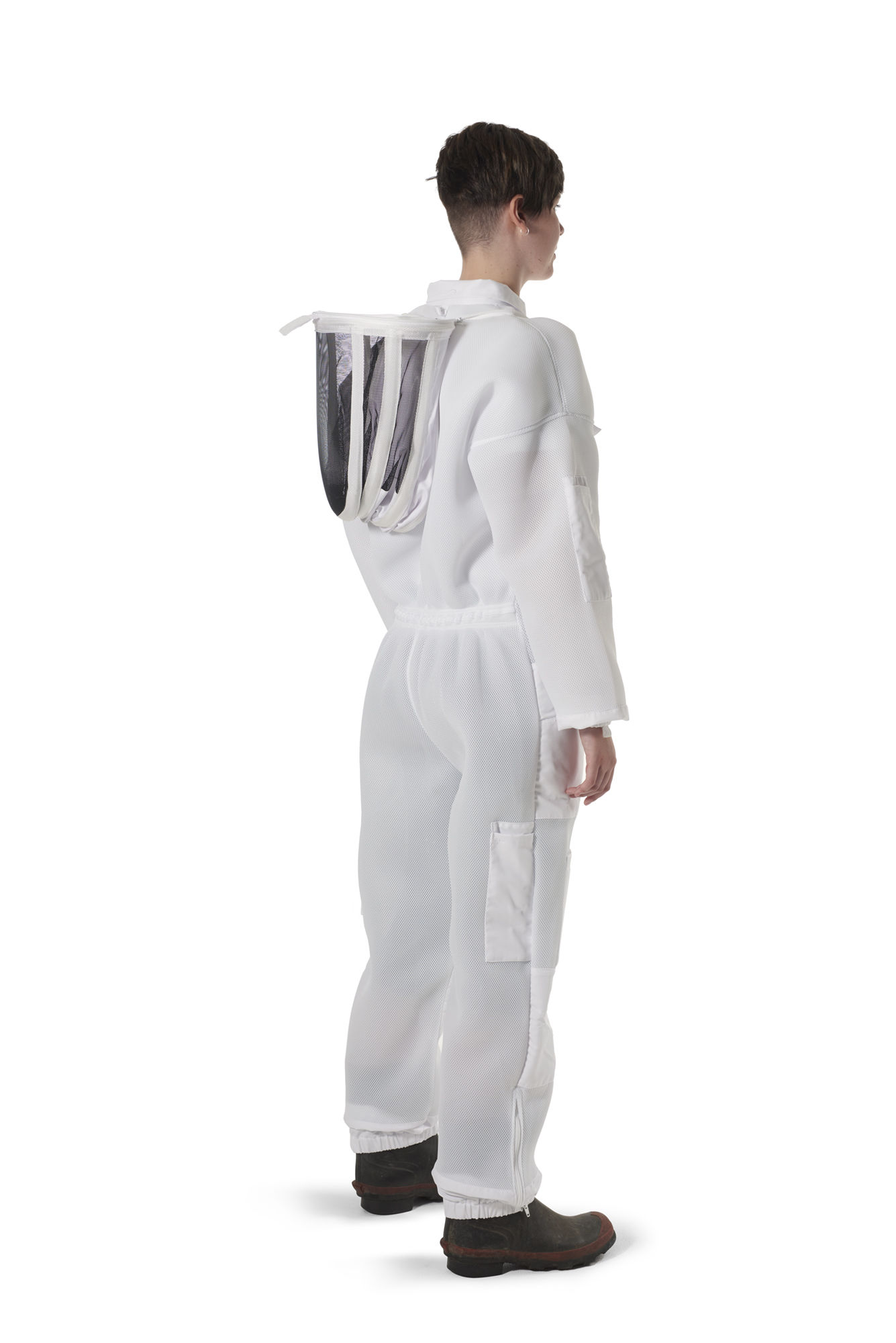 - This white vented bee suit also comes with an improved folding hood for added protection