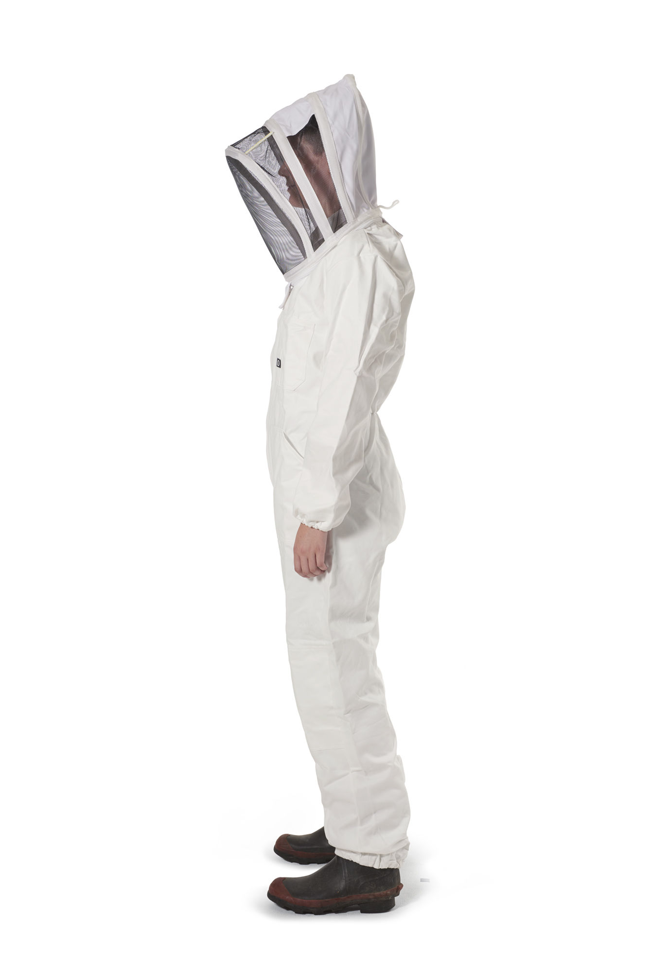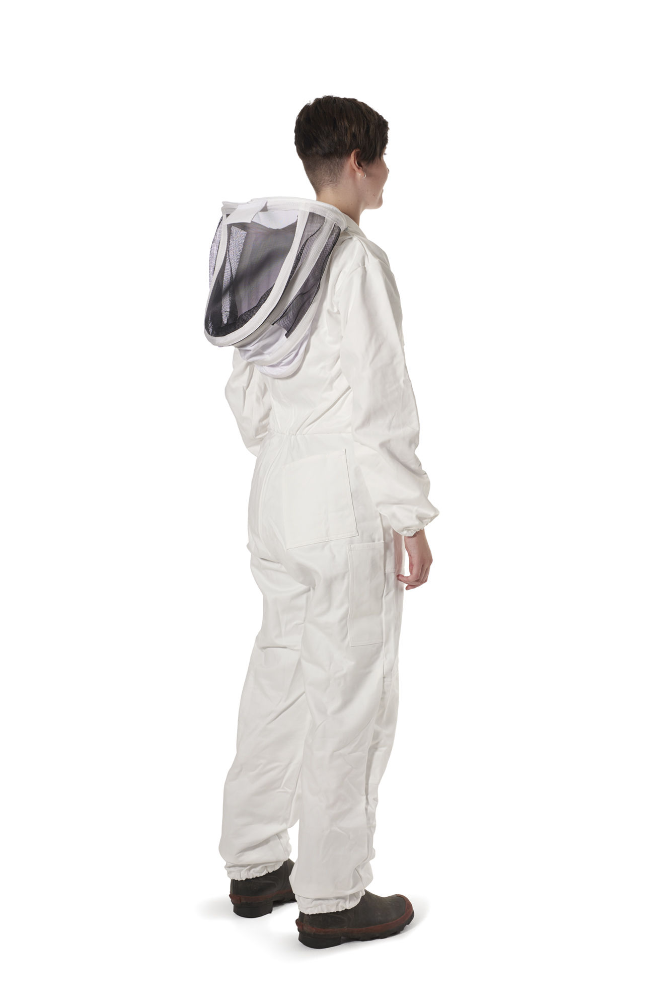 - NZ made 310gsm 100% woven cotton drill overall which includes - additional length & elastic in arms & legs, extended brass zip & double fabric on knees, supplied complete with a folding hood which is attached by zips at the neck